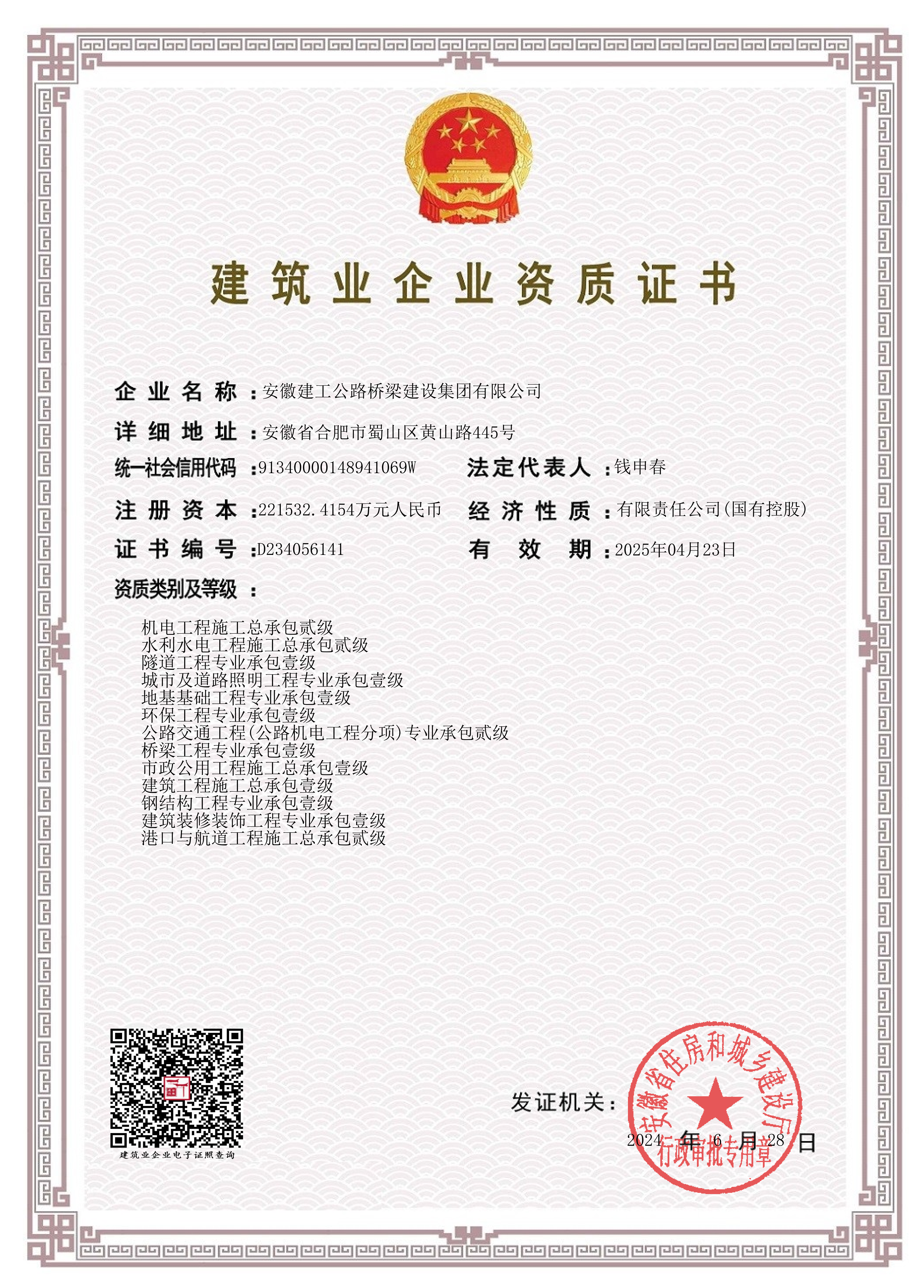 隧道工程專業(yè)承包壹級(jí)、城市及道路照明工程專業(yè)承包壹級(jí)、地基基礎(chǔ)工程專業(yè)承包壹級(jí)、環(huán)保工程專業(yè)承包壹級(jí)、橋梁工程專業(yè)承包壹級(jí)、市政公用工程施工總承包壹級(jí)、建筑工程施工總承包壹級(jí)、鋼結(jié)構(gòu)工程專業(yè)承包壹級(jí)、建筑裝修裝飾工程專業(yè)承包壹級(jí)